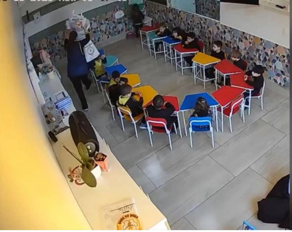 Nas imagens, a professora aparece gritando com o menino e, logo depois, o agride com uma pilha de livros. Na gravação das câmeras de segurança, é possível ouvir o impacto no momento da batida. Em seguida, coloca os materiais sobre uma mesa, pega um papel para limpar a criança e, por fim, segura sua mão e o conduz para lavar a boca.