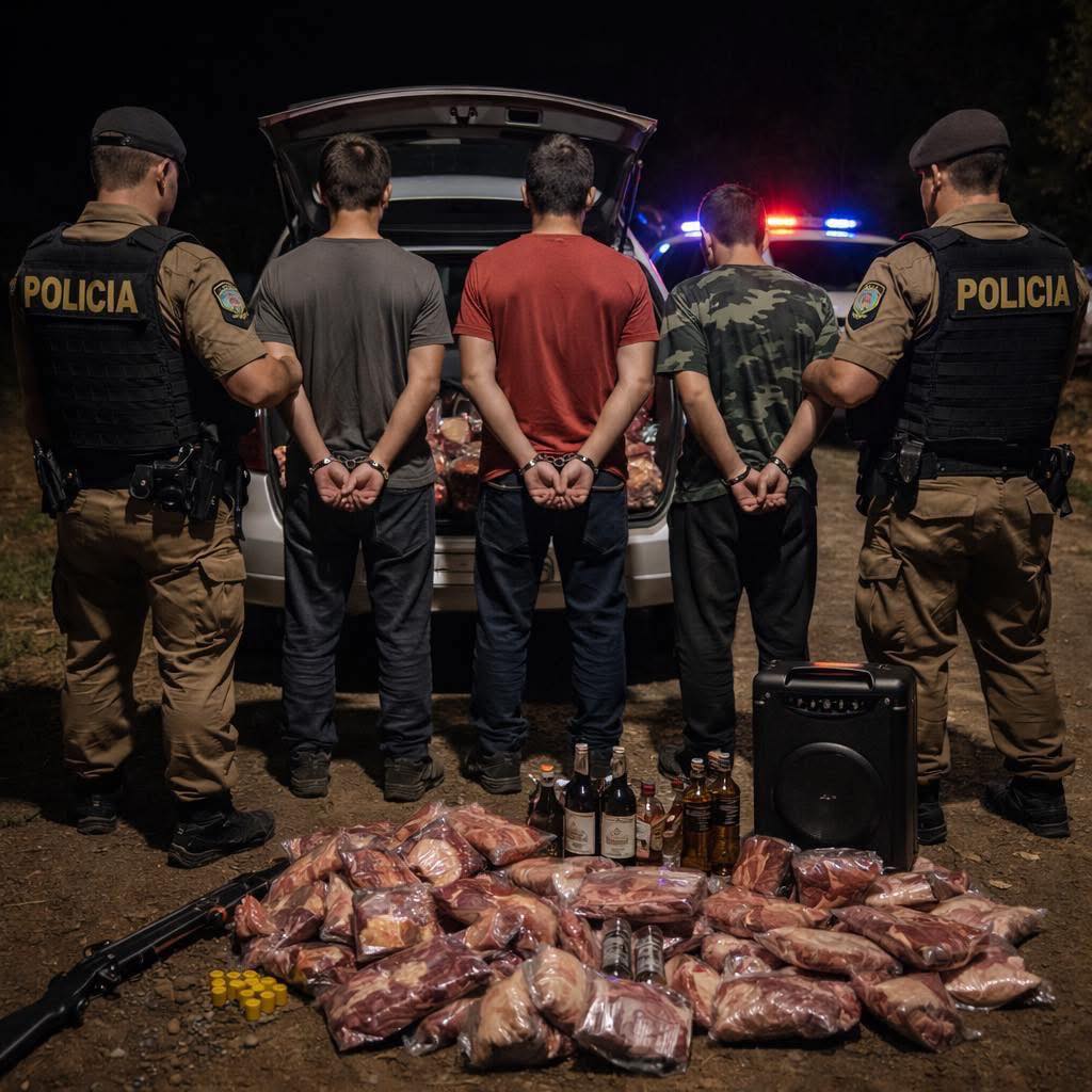No interior do veículo, ocupado por três homens, foram encontradas diversas peças de carne, principalmente picanha, além de bebidas alcoólicas e outros produtos. Após a abordagem, os policiais confirmaram que os itens haviam sido furtados de um supermercado da cidade ainda no mesmo dia.