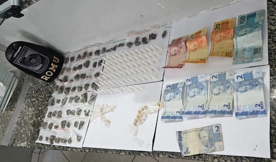 Durante a revista pessoal, os agentes localizaram uma quantidade de entorpecentes com o indivíduo. Ao recuperarem a sacola dispensada, foram encontrados 70 pinos de cocaína, 64 porções de maconha, 40 pedras de crack, além de R$ 160,00 em dinheiro e um aparelho celular da marca Motorola.